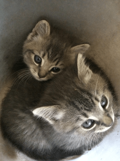 In 2016, these two kittens were born to a feral mother cat. She showed up at our garage with them when they were about four weeks old. We had a bucket tipped over on its side near the steps, and they crawled inside.
