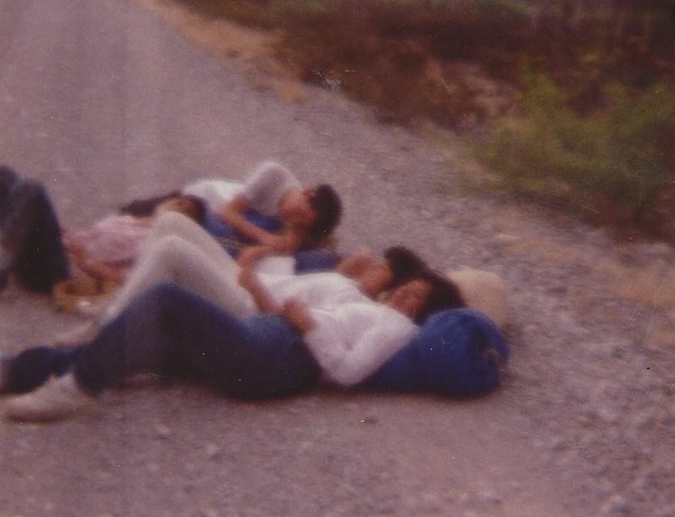 “Then we began to walk again, this time with much singing and laughing. I think we went about 2-2 ½ miles before we (got tired and) laid down in the gravel road to rest. I took a couple of pictures, and while I was standing, I saw a pickup truck coming. We waved it down, and the man gave us a ride as far as San Francisco. There were 5 little kids in the cab, and when we climbed in the back, they were all giggling.