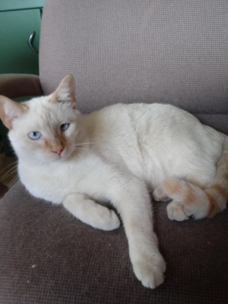 The star of this month’s Cat Tail is Dumbo, my brother’s cat. Dumbo is a 2-year-old Flame Point Siamese male. I asked my brother if he would share some photos and interesting details about Dumbo, who is very unique.