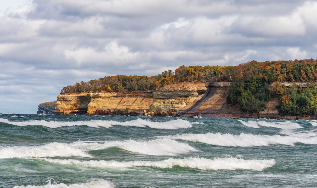On the southern shore of Lake Superior in Michigan’s Upper Peninsula lie the Pictured Rocks. The name comes from the streaks of mineral stain on the sandstone cliffs. The rocks include unusual formations including a row of cliffs that are known as Battleship Row.