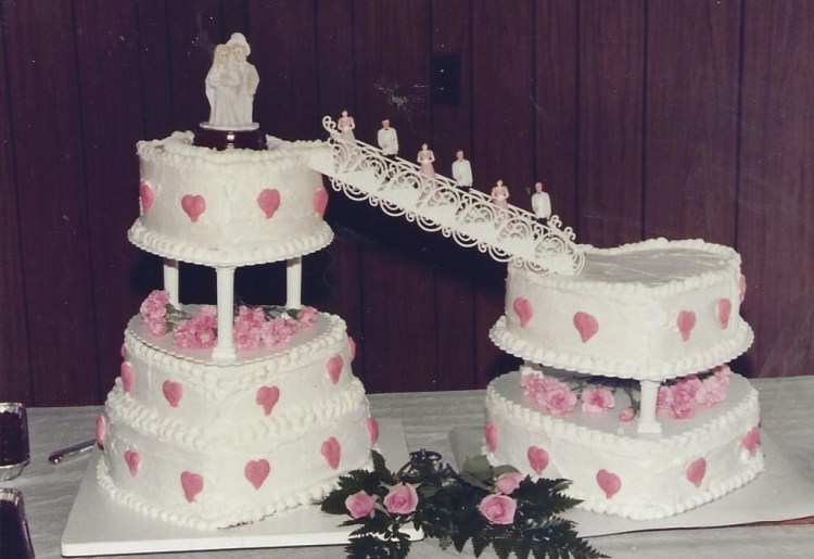 One of the things we saved money on was our wedding cake. There were two people we knew who did wedding cakes as a side business and neither of them could make ours. One suggested we make our own cake. So we decided to. Since it was a February wedding and close to Valentine’s Day, we went with a heart-shaped cake.